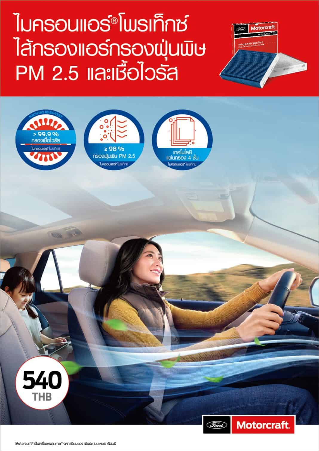 ฟอร์ด ประเทศไทย เปิดตัว ไมครอนแอร์® โพรเท็กซ์ ไส้กรองแอร์คุณภาพสูงรุ่นใหม่ภายใต้แบรนด์มอเตอร์คราฟท์ที่จะช่วยให้อากาศในห้องโดยสารสะอาดและบริสุทธิ์ด้วยคุณสมบัติในการกรองฝุ่น PM2.5 ปกป้องและยับยั้งการเติบของเชื้อไวรัสและแบคทีเรีย ลดสารก่อภูมิแพ้ ควัน และอนุภาคอื่นๆ รวมถึงดูดซับแก๊สหรือกลิ่นไม่พึงประสงค์จากภายนอกได้อย่างดีเยี่ยม ไส้กรองแอร์ ไมครอนแอร์® โพรเท็กซ์ พร้อมจำหน่ายและติดตั้งแล้ววันนี้สำหรับรถฟอร์ด เรนเจอร์ ตั้งแต่รุ่นปี 2011 และฟอร์ด เอเวอเรสต์ ตั้งแต่รุ่นปี 2015 ที่ศูนย์บริการฟอร์ดทั่วประเทศ