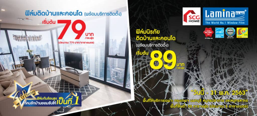 ต่อที่ 1 ติดฟิล์มกันร้อนหรือฟิล์มนิรภัยลามิน่าให้บ้าน, คอนโด หรืออาคารวันนี้รุ่นท็อป ซีรี่ส์ (Top Series) เริ่มต้นเพียง 79 บาท/ตารางฟุต และรุ่นโกลว์ แอนด์ โคลด์ ซีรี่ส์ (Glow & Cold Series) เริ่มต้น 85 บาท/ตารางฟุต (จากปกติ 135 บาท/ตารางฟุต)