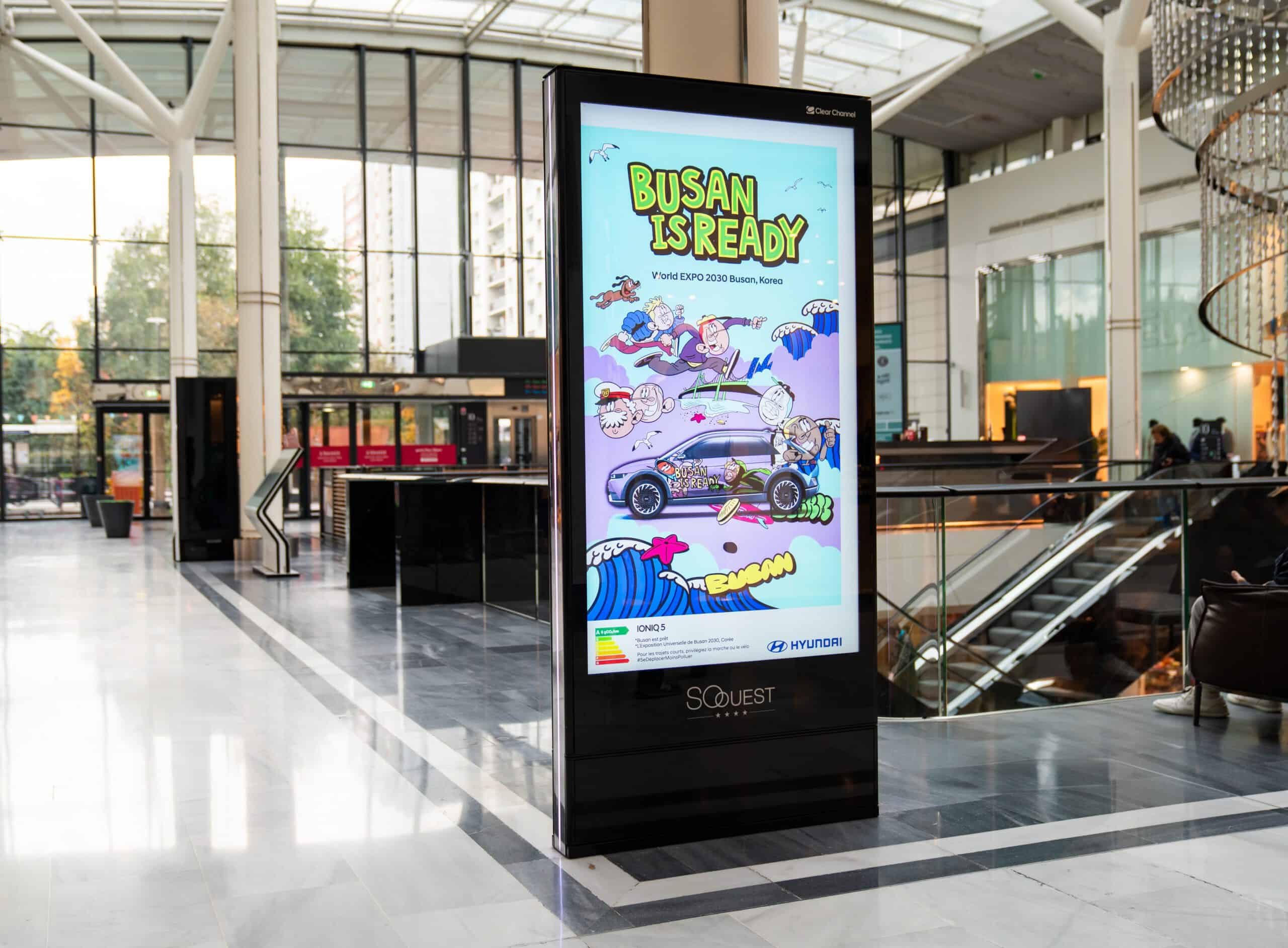 ฮุนได มอเตอร์ กรุ๊ป จะเผยแพร่โฆษณาผ่านจอดิจิตอล ที่ตั้งอยู่ในย่านที่มีการจราจรหนาแน่นของปารีส เช่น Terne district, Gare Saint-Lazare และ La Défense เพื่อสนับสนุนให้ปูซานได้รับการคัดเลือก
