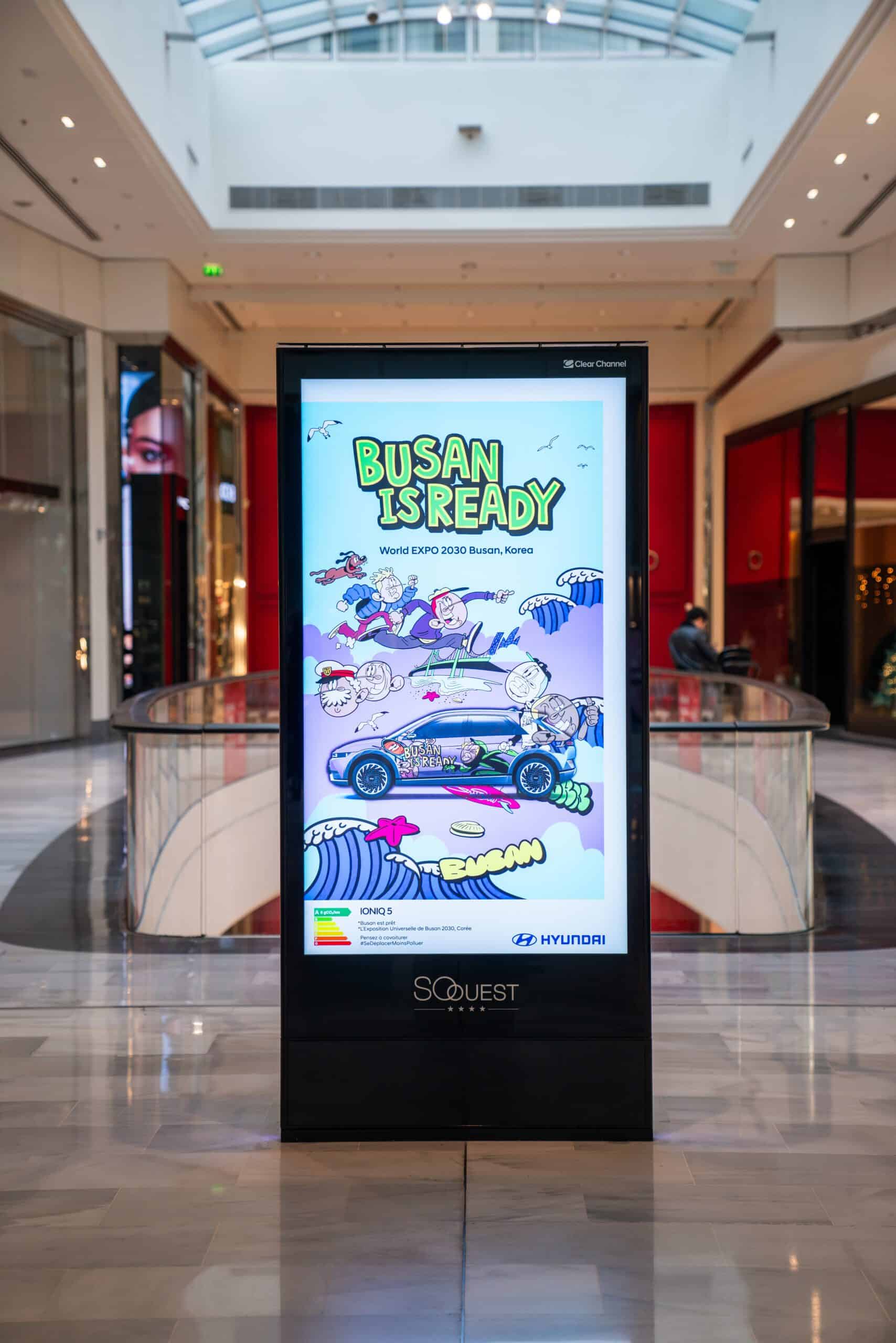 ฮุนได มอเตอร์ กรุ๊ป มุ่งมั่นให้มาตรการนี้จะช่วยส่งเสริมให้ปูซาน ได้รับการคัดเลือกเป็นสถานที่จัดงาน 2030 World Expo ด้วยการเผยแพร่โฆษณากลางแจ้งภายใต้ความร่วมมือของ JAY FLOW ศิลปินกราฟฟิตี้ชั้นนำจากเกาหลี โดยโฆษณาจะออกอากาศผ่านจอดิจิตอลจำนวนราว 270 จอ ซึ่งติดตั้งอยู่ทั่วเขตเมืองและย่านศูนย์การค้าของปารีส ตลอดเดือนพฤศจิกายน