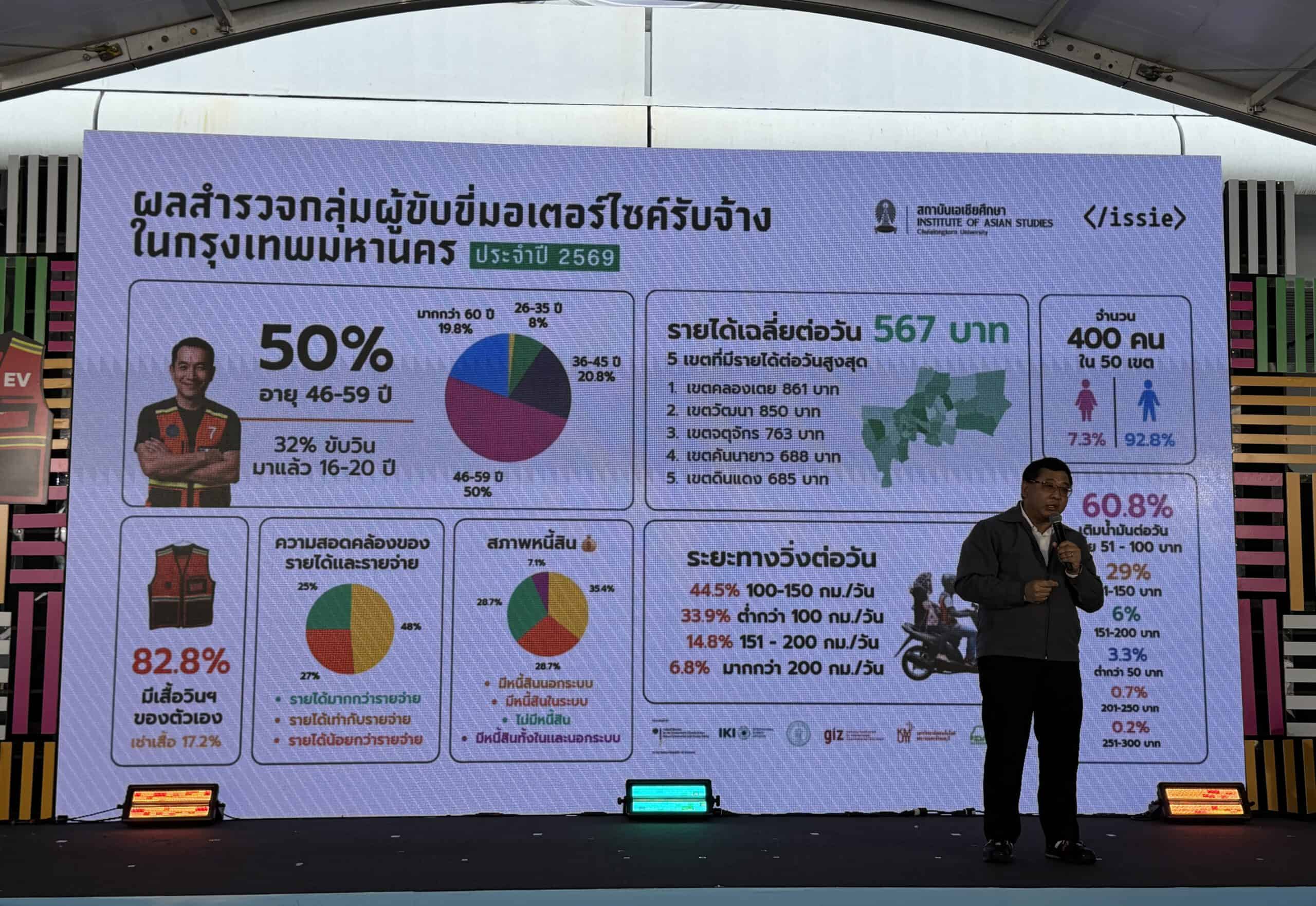 ดร.โดมินิกา คาลินอฟสกา ผู้อำนวยการโครงการด้านการขนส่ง ประเทศไทย จาก GIZ เปิดเผยผลการศึกษาวินมอเตอร์ไซค์ใน กรุงเทพมหานคร พบว่า ผู้ขับขี่รถมอเตอร์ไซค์สันดาปภายในมีค่าใช้จ่ายด้านเชื้อเพลิงเฉลี่ยราว 19,000-49,000 บาทต่อปี ขณะที่รถมอเตอร์ไซค์ไฟฟ้าจะลดลงค่าใช้จ่ายได้สูงสุด 7 เท่า เหลือเพียงประมาณ 7,200 บาทต่อปี ช่วยเพิ่มรายได้สุทธิและลดภาระให้ผู้ขับขี่ พร้อมลดฝุ่น PM2.5 ในเมืองได้ราว 16 ตันต่อปี อย่างไรก็ตาม แม้ EV จะได้รับความสนใจมากขึ้น แต่ผู้ขับขี่จำนวนมากยังกังวลถึงข้อจำกัดด้านราคาตัวรถ ความพร้อมของโครงสร้างพื้นฐาน ระบบแบตเตอรี่ และความเหมาะสมต่อการใช้งานจริง