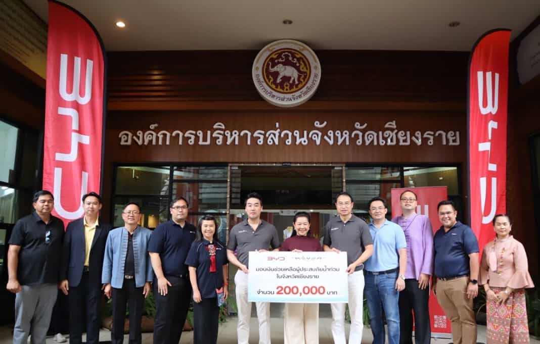 นายหลิว เสวียเลี่ยง ผู้จัดการทั่วไป ฝ่ายขาย บีวายดี ออโต้ เอเชียแปซิฟิก พร้อมด้วย นายประธานวงศ์ พรประภา ประธานเจ้าหน้าที่บริหาร กลุ่มธุรกิจเรเว่ และบริษัท เรเว่ ออโตโมทีฟ จำกัด ผู้จัดจำหน่ายและให้บริการหลังการขายรถยนต์พลังงานไฟฟ้า BYD อย่างเป็นทางการในประเทศไทย ร่วมแสดงความห่วงใยและส่งต่อกำลังใจให้พี่น้องชาวไทย มอบเงินช่วยเหลือผู้ประสบอุทกภัยในจังหวัดเชียงรายจำนวน 200,000 บาท ผ่านองค์การบริหารส่วนจังหวัดเชียงราย