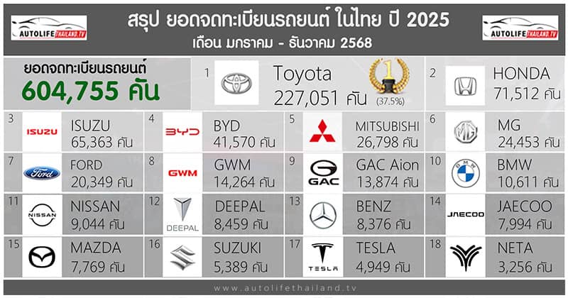 สรุป ยอดจดทะเบียนรถยนต์ ในไทย ปี 2025 รวม 604,755 คัน | Toyota อันดับ 1 ส่วนแบ่งตลาด 37.5%
