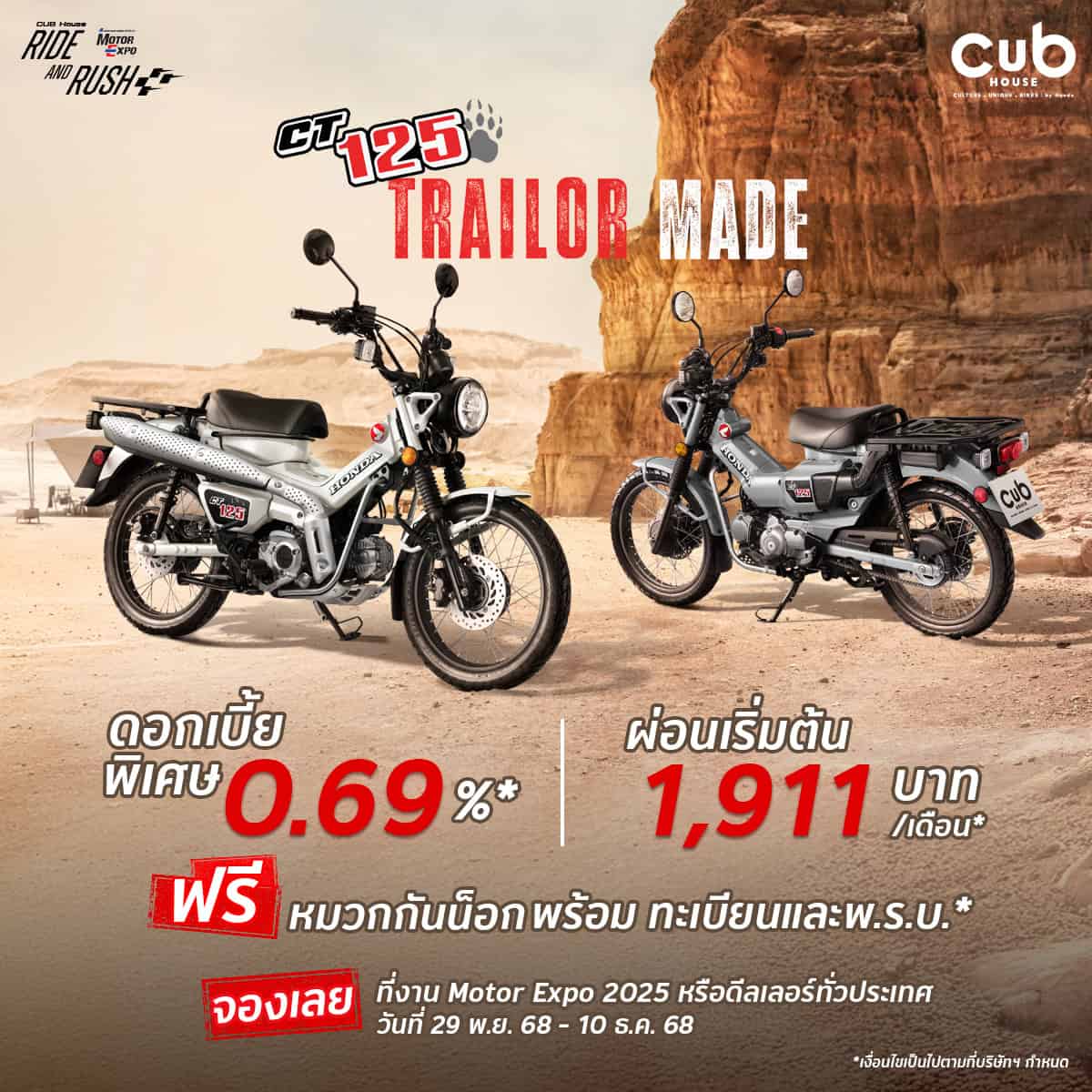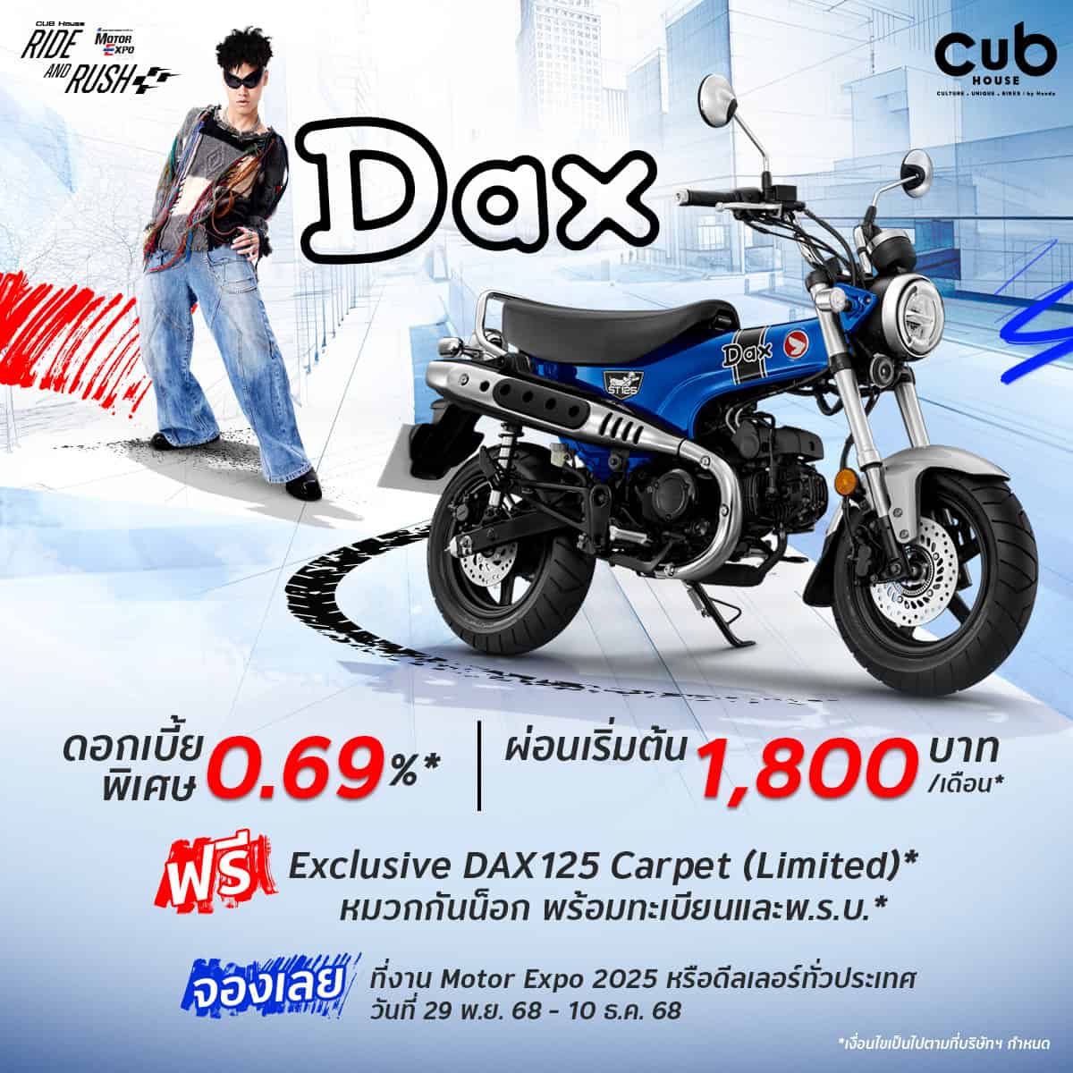 CUB House by Honda จัดโปรโมชั่นภายในงานมหกรรมยานยนต์ ครั้งที่ 42 หรือ มอเตอร์ เอ็กซ์โป (Motor Expo 2025) สำหรับรถจักรยานยนต์ CUB House อาทิ Honda Dax, Honda Monkey, Honda C125 และ Honda CT125 พร้อมสิทธิพิเศษ ดอกเบี้ยพิเศษ 0.69%, ผ่อนเริ่มต้นเพียง 1,800 บาทต่อเดือน, และฟรีหมวกกันน็อกพร้อมทะเบียนและ พ... รวมถึงสิทธิ์การซื้อชุดแต่ง KITACO Special Sets ราคาพิเศษ เฉพาะในงานเท่านั้น