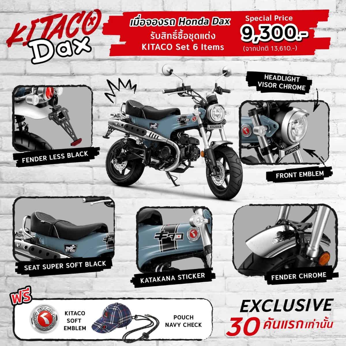• Dax KITACO Set ราคา 9,300 บาท จากปกติ 13,610 บาท เฉพาะ 30 คันแรกเท่านั้น รับรายการชุดแต่ง 6 ชิ้น ประกอบด้วย Fender Less Black, Seat Super Soft Black, Katakana Sticker, Headlight Visor Chrome, Front Emblem และ Fender Chrome พร้อมรับของพรีเมียม KITACO Soft Emblem และ Pouch Navy Check