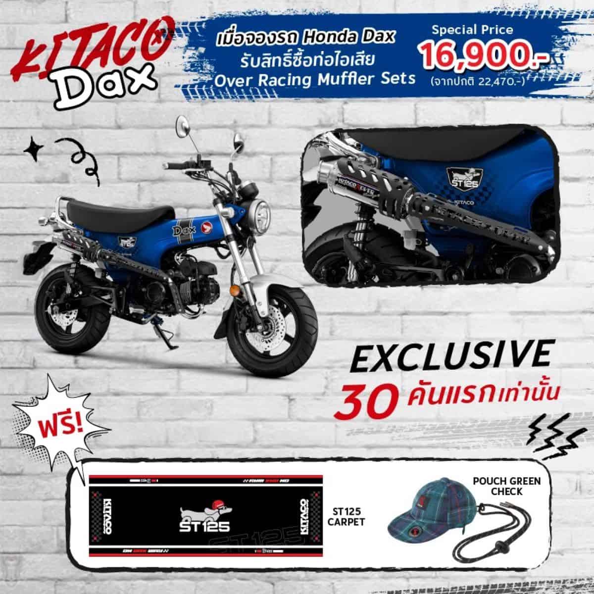 • Dax Over Racing Muffler Set ราคา 16,900 บาท จากปกติ 22,470 บาท เฉพาะ 30 คันแรกเท่านั้น พร้อมรับของพรีเมียม ST125 Carpet และ Pouch Green Check