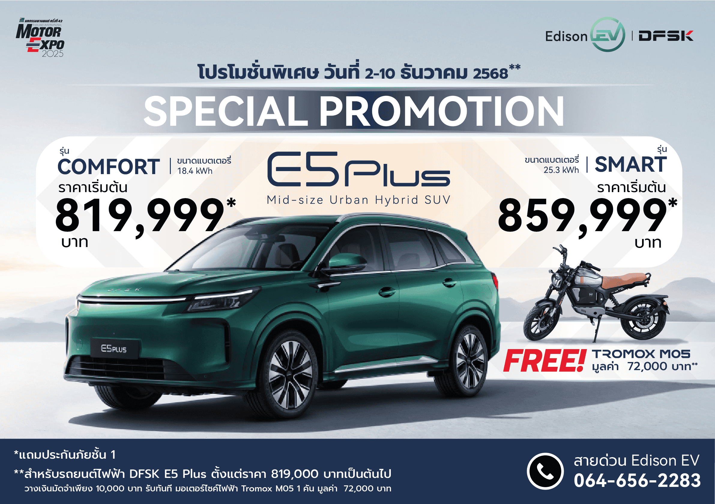 นายอี้ จั้ว เถียน (Mr. Yi Zhou Tian) ผู้ก่อตั้ง บริษัท เอดิสัน อีวี จำกัด เปิดเผยว่า บริษัทได้เปิดตัว DFSK E5 Plus รถยนต์อเนกประสงค์ (เอสยูวี) อย่างเป็นทางการในงาน Motor Expo 2025 โดยเปิดราคาเริ่มต้น 799,999 บาท โดยวางตำแหน่งผลิตภัณฑ์ไว้ในกลุ่ม รถยนต์อเนกประสงค์ขนาดกลาง (Mid-size SUV) โดยมาพร้อม 2 รุ่นย่อยดังนี้