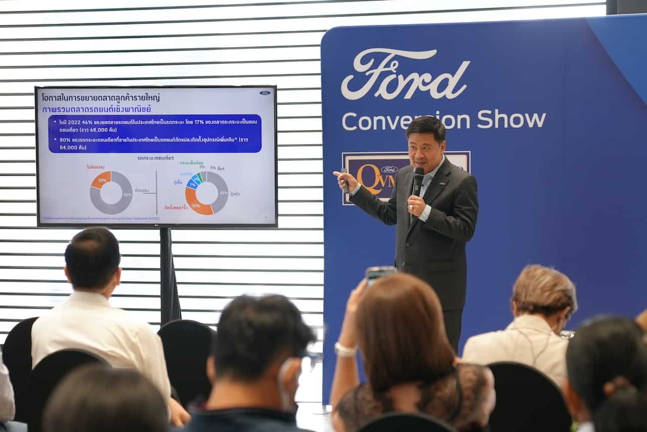 ฟอร์ด ประเทศไทย ประกาศกลยุทธ์รุกตลาดลูกค้ารายใหญ่ด้วยรถยนต์ฟอร์ดดัดแปลงเพื่อผลักดันธุรกิจให้เติบโตต่อเนื่อง ชูความแตกต่างด้วยการต่อยอดจุดแข็งของรถยนต์ฟอร์ดที่โดดเด่นด้วยสมรรถนะ และความอเนกประสงค์ครบครันตั้งแต่รุ่นเริ่มต้น ผนวกกับการยกระดับมาตรฐานรถดัดแปลงด้วยโปรแกรม Qualified Vehicle Modifier (QVM) ของฟอร์ด พร้อมนำเสนอโซลูชันพิเศษสำหรับกลุ่มลูกค้ารายใหญ่ พร้อมอำนวยความสะดวกลูกค้าด้วยนวัตกรรมด้านบริการของฟอร์ด โดยในงาน Ford Conversion Show ได้นำตัวอย่างรถยนต์ฟอร์ดดัดแปลงเพื่อการพาณิชย์ อาทิ รถตู้เย็น รถพยาบาลฉุกเฉิน รถกระเช้า รถจัดส่งสินค้า รถบริการเคลื่อนที่ ที่ผ่านการออกแบบและพัฒนาโดยพันธมิตรที่ผ่านการรับรองภายใต้โปรแกรม QVM อย่างบริษัท อาร์เอ็มเอ ออโตโมทีฟ จำกัด และบริษัท เอสเอสเอส ออโตโมทีฟ อินดัสทรี จำกัด มาจัดแสดง ณ ศูนย์การเรียนรู้และฝึกอบรมบุคลากรฟอร์ด