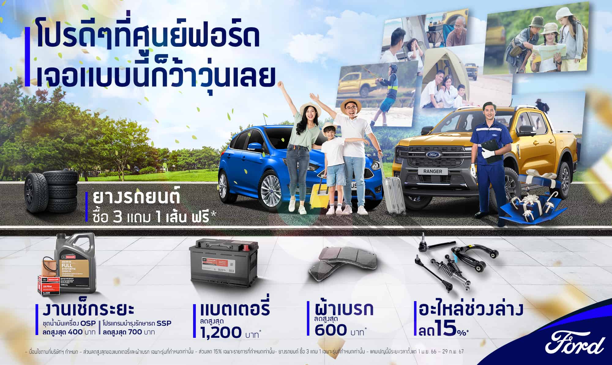 ฟอร์ด ประเทศไทย มอบแคมเปญข้อเสนอสุดคุ้มด้านบริการให้ลูกค้าอุ่นใจตลอดเส้นทางตลอดช่วงเทศกาลพิเศษ ได้แก่ ส่วนลดค่าอะไหล่ช่วงล่างและโช้คอัพถึง 15% ส่วนลดพิเศษชุดน้ำมันเครื่องสุดคุ้มสูงสุด 400 บาทหรือส่วนลดโปรแกรมบำรุงรักษาตามระยะสูงสุด 700 บาท ซื้อยางรถยนต์ 3 เส้น แถมฟรี 1 เส้น ส่วนลดเมื่อเข้ารับบริการเปลี่ยนแบตเตอรี่หรือผ้าเบรก และบริการตรวจเช็คสภาพรถ 30 รายการฟรี เพียงนำรถเข้ารับบริการที่ศูนย์บริการฟอร์ดทั่วประเทศ ตั้งแต่วันนี้ ถึง 29 กุมภาพันธ์ 2567