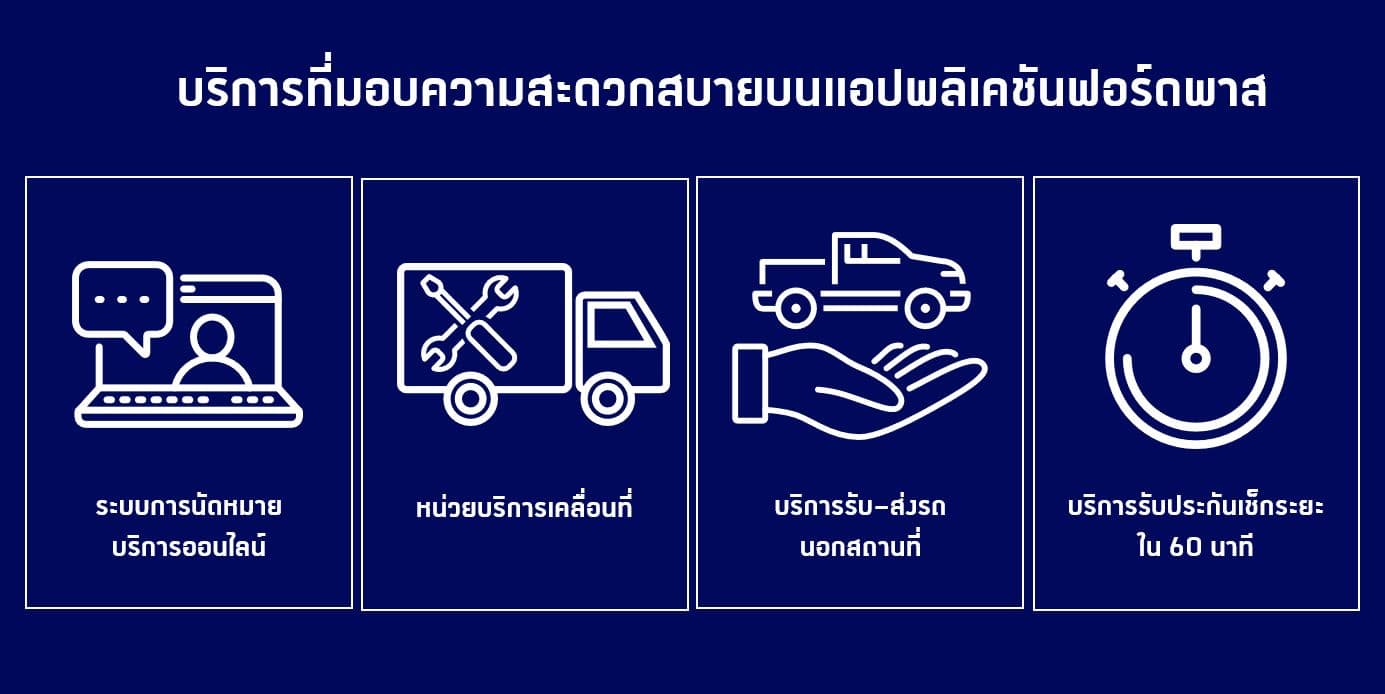 ฟอร์ดมุ่งมั่นที่จะสร้างความทันสมัยในทุกมิติให้กับทั้งลูกค้ารถฟอร์ด เจเนอเรชันใหม่ และรถรุ่นก่อนหน้า เพื่อให้นัดหมายเข้ารับบริการได้ง่ายๆ เพียงแค่ปลายนิ้วผ่านแอปพลิเคชันฟอร์ดพาส และเว็บไซต์ www.ford.co.th ด้วยการผนวก 4 งานบริการหลัก ได้แก่ การนัดหมายหน่วยบริการเคลื่อนที่ (Mobile Service Vehicle) บริการรับ–ส่งรถนอกสถานที่ (Pick-up and delivery service) บริการรับประกันเช็กระยะใน 60 นาที และบริการนัดหมายทั่วไป โดยฟอร์ดมอบความสะดวกและความปลอดภัยแบบครบวงจร ให้ลูกค้ามั่นในทุกขั้นตอนตั้งแต่การนัดหมายเข้ารับบริการ การยืนยันรายละเอียดการบริการ การยืนยันตัวตนพนักงานหรือช่างเทคนิคที่ได้รับมอบหมายงาน การตรวจสอบและติดตามสถานะการเดินทาง และสถานะการบริการที่ดูได้จากหน้าจอแบบทันท่วงที ทั้งยังสามารถเข้าถึงลูกค้าในพื้นที่ห่างไกลด้วยมาตรฐานเดียวกับศูนย์บริการ