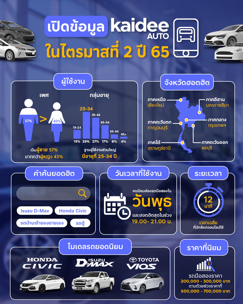 นอกจากนี้ ยังเผยสถิติการใช้งานบนแพลตฟอร์ม Kaidee Auto ในไตรมาส 2 ปี 2565 ที่น่าสนใจดังนี้