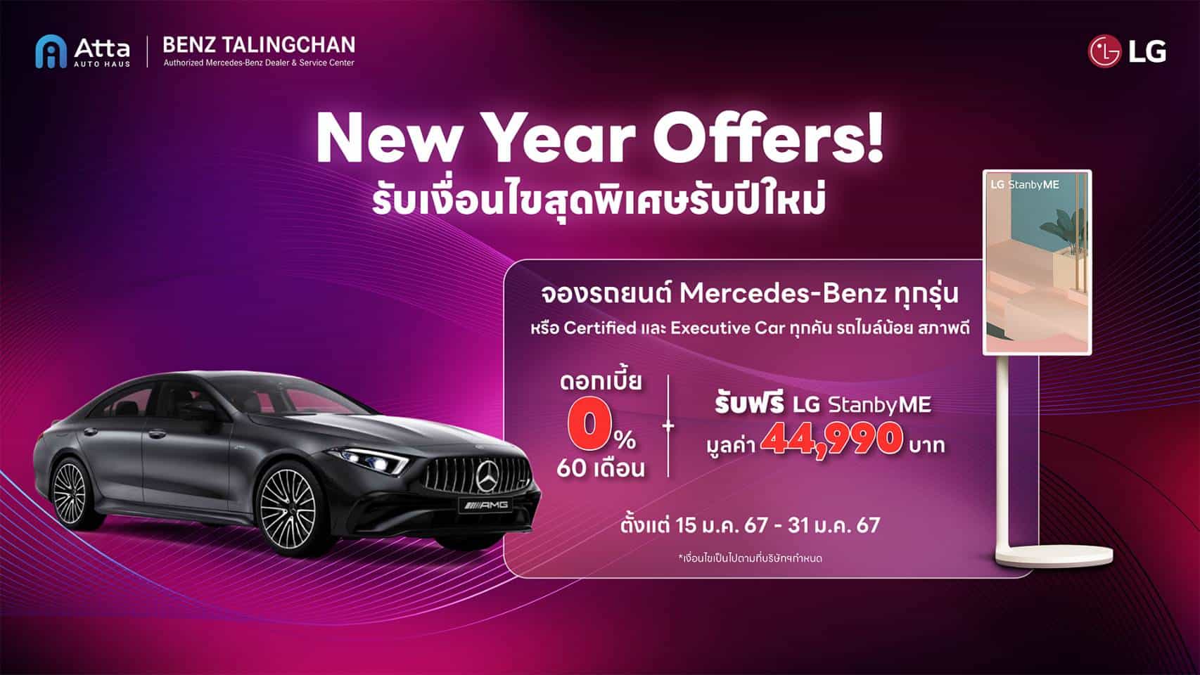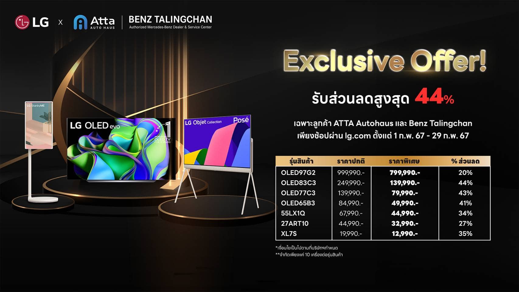 แอทต้า ออโต้เฮ้าส์ยังมอบของขวัญสุดพิเศษเป็น LG StanbyME จอไลฟ์สไตล์มูลค่า 44,990 บาทให้แก่ลูกค้าที่จองรถเมอร์เซเดส–เบนซ์รุ่นใดก็ได้ รวมถึงรถยนต์สำหรับกลุ่มผู้บริหาร (Executive car) ทุกรุ่น ตั้งแต่วันนี้จนถึงวันที่ 31 มกราคม 2567 นอกจากนี้ แอลจียังมอบส่วนลดพิเศษสูงสุด 44% ให้แก่ลูกค้าแอทต้า ออโต้เฮ้าส์และเบนซ์ตลิ่งชันที่สนใจสินค้าทีวีของแอลจี รับสิทธิซื้อทีวีแอลจีในราคาพิเศษได้ตั้งแต่วันที่ 1-29 กุมภาพันธ์ 2567 ได้ที่ www.lg.com/th โดยสามารถติดต่อรับโค้ดส่วนลดได้จากฝ่ายลูกค้าสัมพันธ์ของแอทต้า ออโต้เฮ้าส์