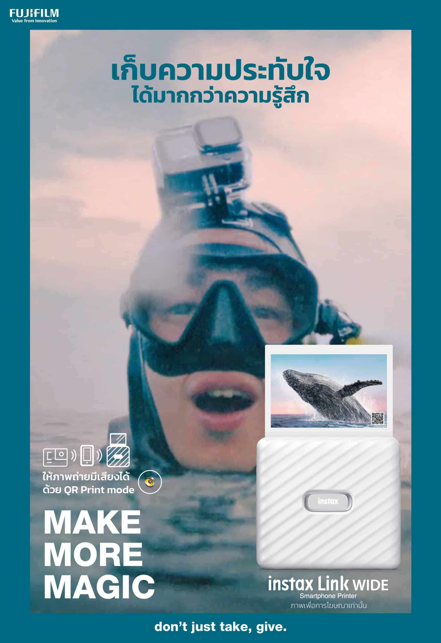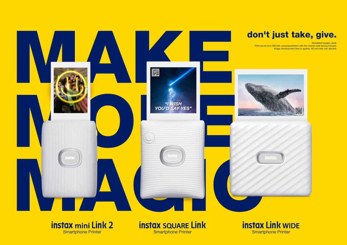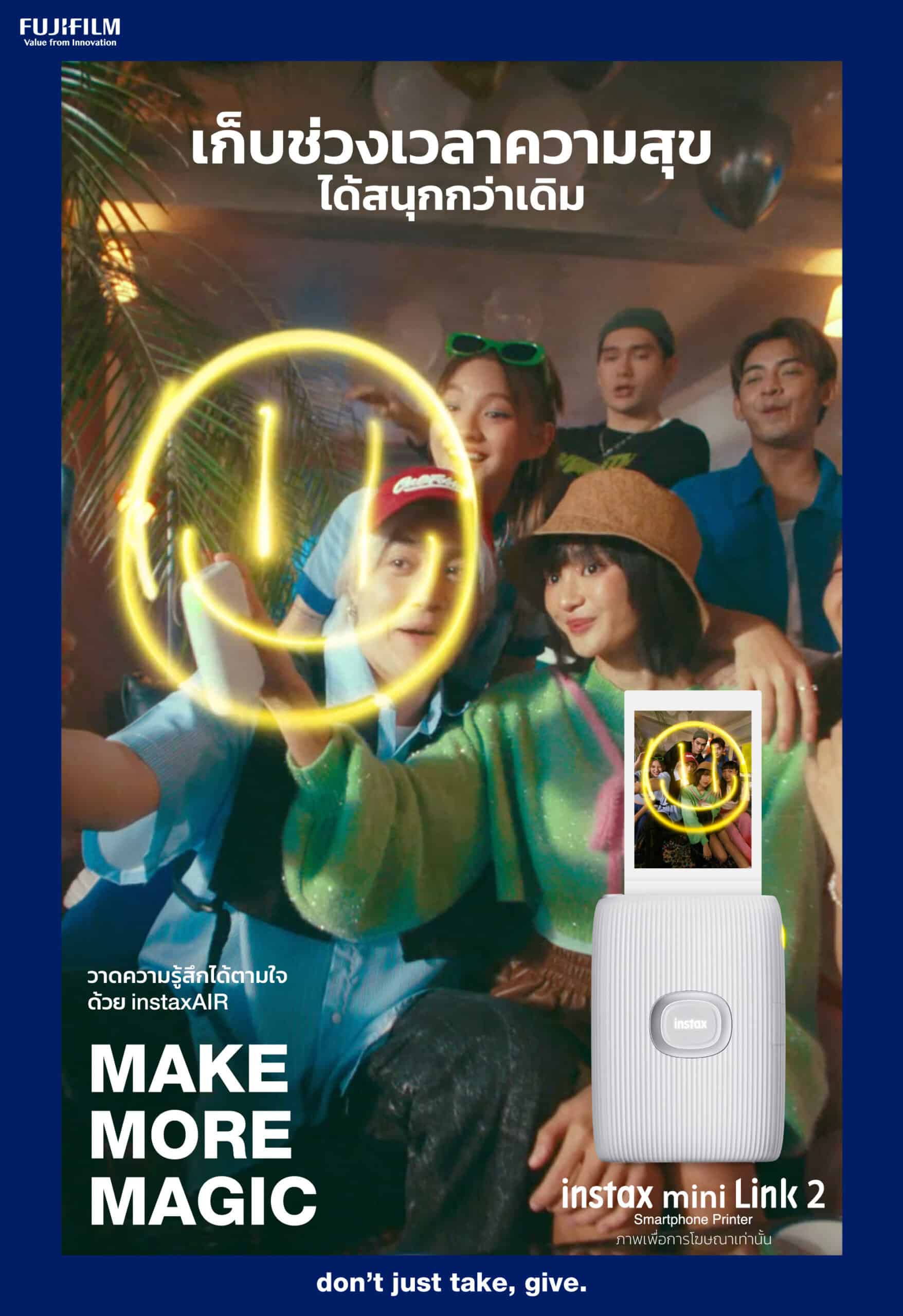 นอกจากการถ่ายทอดเสน่ห์ของการเก็บช่วงเวลาสำคัญของชีวิตด้วยการปรินต์ภาพแล้ว ในโฆษณาชุดพิเศษ “Make More Magic” ที่เริ่มออกสู่สายตาคนไทยทั้งทางโซเชียลมีเดีย สื่อร้านค้าในห้างสรรพสินค้าชั้นนำ และสื่อ OOH ใจกลางกรุงเทพฯ ฟูจิฟิล์ม ยังได้สร้างความประทับใจด้วยการบอกเล่าถึงคุณสมบัติพิเศษของ ปรินเตอร์ฟิล์มอินสแตนท์จากตระกูล INSTAX Link ของฟูจิฟิล์มทั้ง 3 รุ่น ได้แก่ INSTAX mini Link 2, INSTAX SQUARE Link และ INSTAX Link WIDE ทั้งสามรุ่นมีขนาดเล็กกะทัดรัด พกพาสะดวกพร้อมออกเดินทางไปสร้างความทรงจำได้ทุกที่ ทั้งยังเชื่อมต่อกับสมาร์ตโฟนได้ง่าย ๆ ผ่านแอป Link ของแต่ละรุ่น (ให้บริการทั้งใน iOS และ Android) เพื่อเลือกภาพ แต่งภาพใส่เอฟเฟกต์พิเศษ และสั่งพิมพ์ได้อย่างรวดเร็วในไม่กี่วินาที ปรินเตอร์ทั้งสามรุ่น นำเสนอฟิล์มอินสแตนท์ในขนาดที่แตกต่างกัน ตอบโจทย์ความต้องการที่หลากหลายในการเก็บช่วงเวลาพิเศษ ด้วยคุณสมบัติที่เป็นเอกลักษณ์เฉพาะของแต่ละรุ่น สร้างความสนุกที่แปลกใหม่ให้แก่ทั้งผู้ปรินต์ภาพและสร้างความประทับใจให้แก่ผู้รับ สอดคล้องกับสโลแกน “don’t just take, give.” ของผลิตภัณฑ์ตระกูล INSTAX ที่ให้ความสำคัญกับการแบ่งปันช่วงเวลาแห่งความสุข