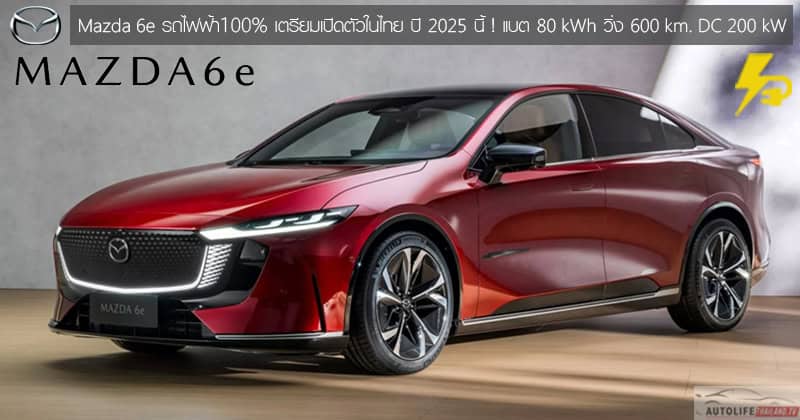 ล่าสุด autolifethailand ได้รับข้อมูลมาว่า Mazda ประเทศไทย จะบุกตลาดรถไฟฟ้า100% โดย Mazda 6e รถไฟฟ้า100% มีแผนเตรียมเปิดตัวในไทย ปี 2025 นี้ แบต 80 kWh วิ่งระยะ 600 km. ชาร์จ DC 200 kW รอลุ้นราคา – ช่วงล่างในสไตล์ MAZDA คาดเปิดรับจองสิทธิ์ในงาน Motor Show 2025 นี้ นำเข้าจากประเทศจีน