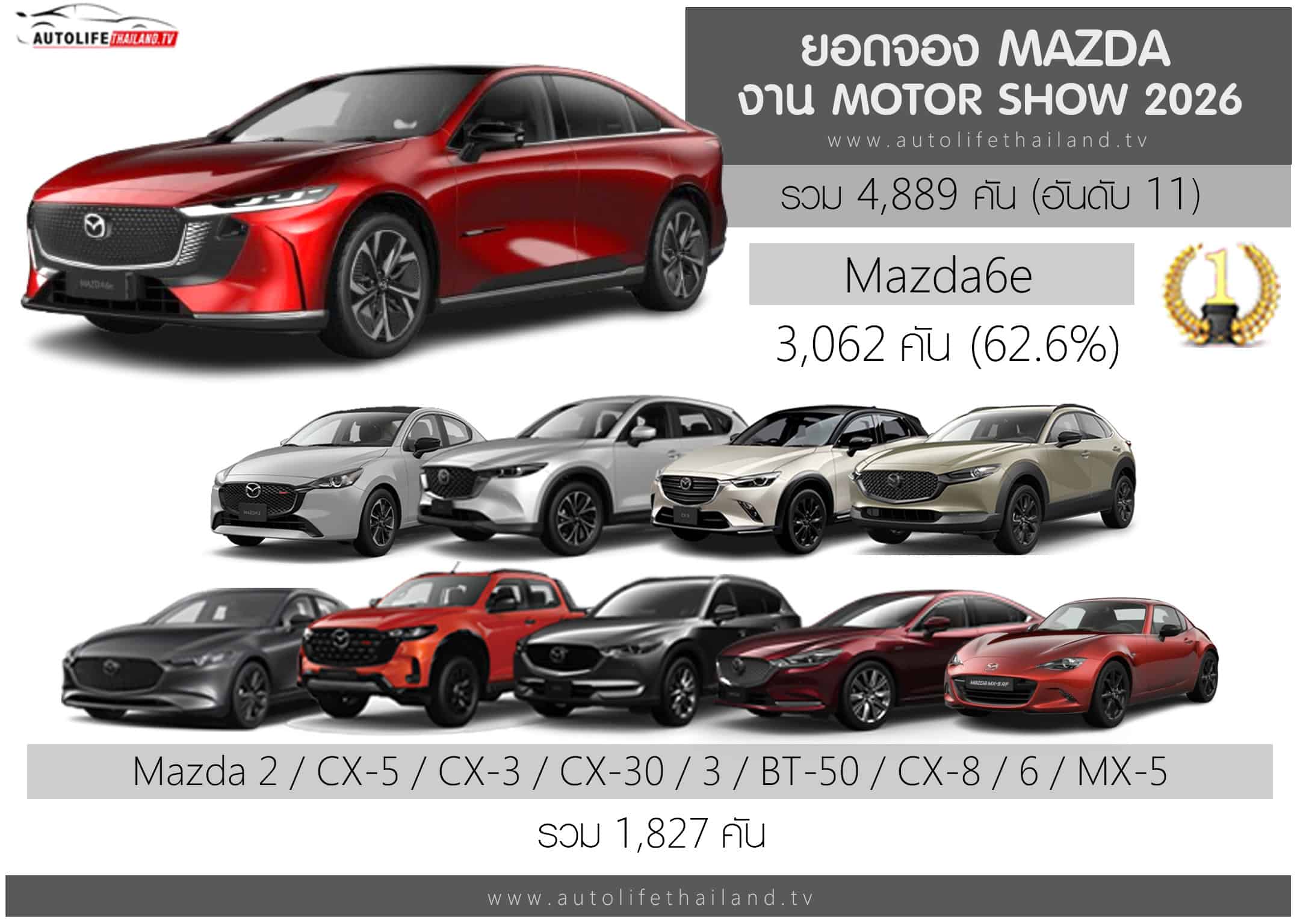 พลิกฟื้นแบรนด์มาสด้า ด้วยรถไฟฟ้า100% ! สรุปยอดจอง มาสด้า ในงาน Motor Show 2026 รวม 4,889 คัน (อันดับ11) | Mazda6e มากสุด รวม 3,062 คัน สัดส่วน 62.6% จองตอนนี้ รับรถปลายปี !