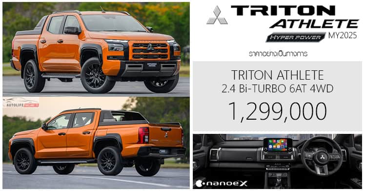 Mitsubishi Triton ATHLETE (MY2025) ราคาอย่างเป็นทางการ : 1,299,000 บาท | 2.4 Bi-TURBO Full-Time 4WD