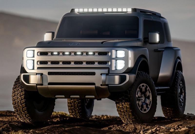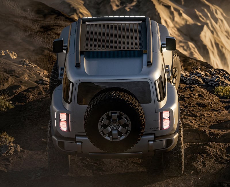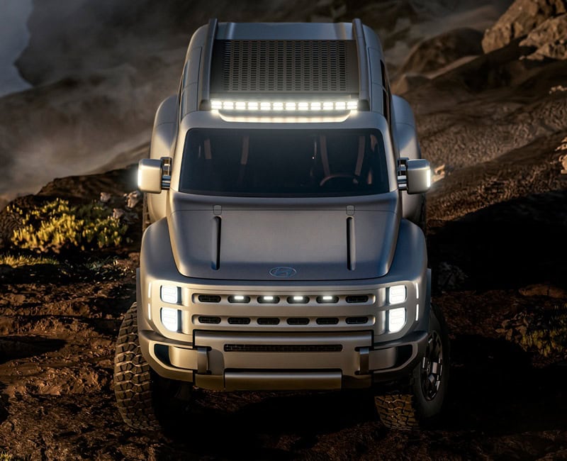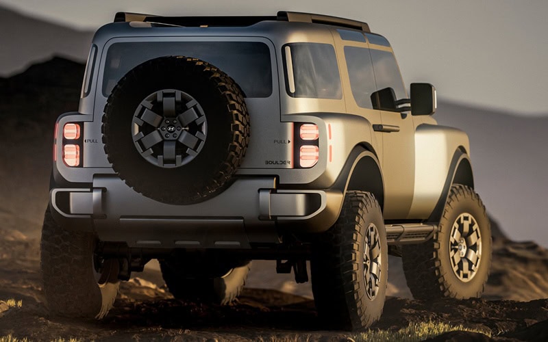 Hyundai Boulder Concept มาพร้อมกับปรัชญาการออกแบบ ‘Art of Steel’ ซึ่งได้แรงบันดาลใจมาจากเทคโนโลยีการผลิตโลหะขั้นสูงของ Hyundai Steel เผยให้เห็นธรรมชาติของโลหะรวมไปถึงความเที่ยงตรง จนเกิดเป็นความทรงพลัง, แกร่ง และเหนือการเวลากับ SUV รูปทรงกล่อง 5 ประตู ที่ดูพร้อมผจญภัยเต็มพิกัดด้วยยาง Mud-Terrain ขนาด 37 x 12.50 R18 ช่วยให้ Ground Clearance สูง พร้อมเพิ่มศักยภาพการปีนป่ายด้วยกันชนหน้าหลังแบบเว้าส่วนล่าง ช่วยเพิ่มมุมไต่และมุมจาก ทั้งยังมีแผ่นโลหะกันกระแทกใต้ท้อง