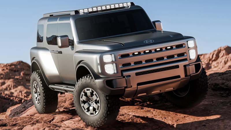 Hyundai Boulder Concept มาพร้อมกับปรัชญาการออกแบบ ‘Art of Steel’ ซึ่งได้แรงบันดาลใจมาจากเทคโนโลยีการผลิตโลหะขั้นสูงของ Hyundai Steel เผยให้เห็นธรรมชาติของโลหะรวมไปถึงความเที่ยงตรง จนเกิดเป็นความทรงพลัง, แกร่ง และเหนือการเวลากับ SUV รูปทรงกล่อง 5 ประตู ที่ดูพร้อมผจญภัยเต็มพิกัดด้วยยาง Mud-Terrain ขนาด 37 x 12.50 R18 ช่วยให้ Ground Clearance สูง พร้อมเพิ่มศักยภาพการปีนป่ายด้วยกันชนหน้าหลังแบบเว้าส่วนล่าง ช่วยเพิ่มมุมไต่และมุมจาก ทั้งยังมีแผ่นโลหะกันกระแทกใต้ท้อง