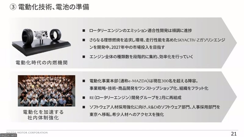 แม้ Mazda จะมีแผนการลดความซับซ้อนของเครื่องยนต์ให้มีทางเลือกน้อยลง แต่บริษัทได้เปิดเผยความคืบหน้าของขุมพลัง Rotary หลังจากตั้งทีมกลับมาใหม่โดยเฉพาะ เมื่อเดือนกุมภาพันธ์ที่ผ่านมาว่า มีความคืบหน้าไม่น้อย แม้จะประสบกับความท้าทายครั้งใหญ่ในการพัฒนาเครื่องยนต์โรตารี่ ให้ผ่านเกณฑ์ควบคุมมลพิษ ทั้งนี้ ยังไม่มีการเปิดเผยข้อมูลเพิ่มเติมเกี่ยวกับสเปคหรือกรอบเวลา