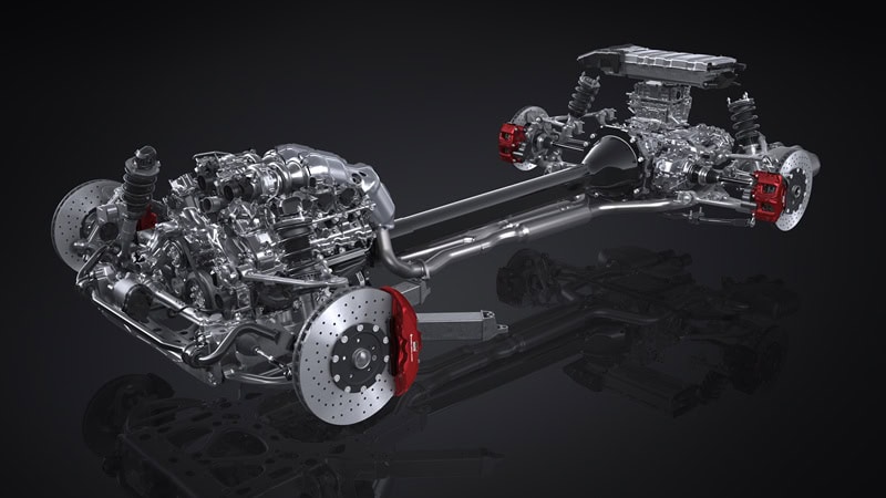 ช่วงล่างของ Toyota GR GT ออกแบบใหม่ทั้งหมดมีจุดยึดต่ำ เป็นแบบ Double Wishbone พร้อมคอยล์สปริง ในด้านหน้าและด้านหลัง อาร์มช่วงล่างเป็น forged อะลูมิเนียม ดิสเบรกเป็น Carbon Ceramic จาก Brembo ทั้งด้านหน้าและด้านหลัง โครงสร้างตัวถัง space frame เป็นอะลูมิเนียมทั้งหมดครั้งแรกของ Toyota ทั้งยังมีการใช้วัสดุ CFRP, พลาสติก และวัดสุอื่นในโครงสร้างตัวถัง ส่งผลให้ทั้งน้ำหนักเบาและแข็งแกร่ง