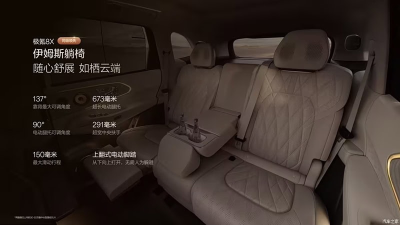 ห้องโดยสารของ Zeekr 8X มีสีให้เลือก 4 สีทั้ง สีแดง Crimson Red, Pure Black, White-Black, and Brown-Black ด้านระบบแสดงผลมีหน้าจอ OLED 3.5K ขนาด 16 นิ้ว พร้อมระบบแสดงผล AR-HUD ขนาด 44 นิ้ว ทำงานร่วมกับเครื่องเสียง Naim 29 ลำโพง เบาะคู่หน้ามีระบบเป่าลมอุ่น-เย็น และระบบนวด ส่วนเบาะแถวหลังปรับเอนได้ 137 องศา ทั้งยังมีจอเพดาน 3K OLED ขนาด 17 นิ้ว และตู้ควบคุมอุณหภูมิได้ทั้งร้อน – เย็น ท้ายรถมีพื้นที่บรรทุกสัมภาระความจุ 1,133 – 2,200 ลิตร