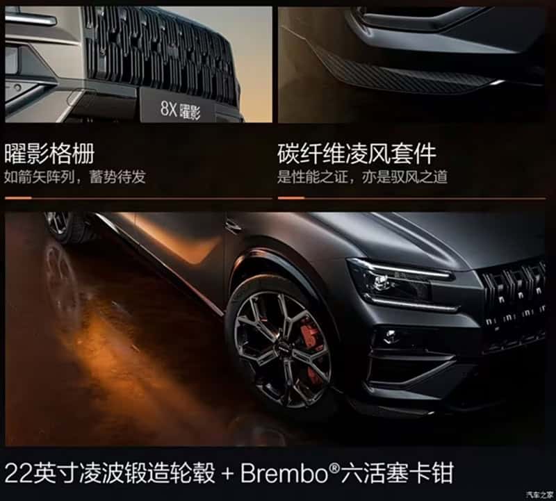 Zeekr 8X มาพร้อมกับกระจังหน้าโครเมี่ยมแนวตั้ง ไฟหน้าเป็นแบบแยกชั้น Matrix ชายล่างตัวถังตัดด้วยสีดำ มือเปิดประตูเป็นแบบก้านดึง ที่ทำงานได้ทั้งแบบกลไกและไฟฟ้าพร้อมระบบประตูดูด ไฟท้ายมาในรูปทรงตัว C ทั้งยังมีทางเลือก Wraith Edition เพิ่มความสปอร์ตด้วยการเปลี่ยนไปใช้สีดำสำหรับการตกแต่ง, ล้อ Forged ขนาด 22 นิ้ว พร้อมยางกว้าง 315 มิลลิเมตร, ชุดแต่งคาร์บอนไฟเบอร์, สปอยเลอร์หลังแบบ Active, ดิฟฟิวเซอร์หลัง และ คาลิปเปอร์เบรก Brembo 6 สูบ