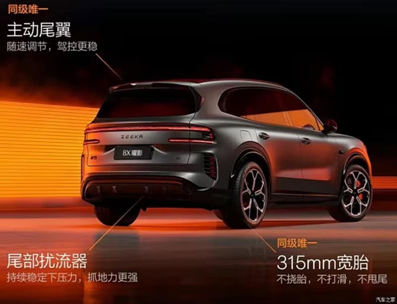ช่วงล่างของ Zeekr 8X เป็นแบบถุงลม Dual Chamber พร้อมกันโคลงไฟฟ้า 48 โวลต์ ปรับเปลี่ยนรูปแบบการขับขี่ได้ 13 รูปแบบ ทั้งยังลุยน้ำได้ลึกสุด 500 มิลลิเมตร ส่วนระบบช่วยเหลือผู้ขับขี่ขั้นสูง รองรับการขับขี่กึ่งอัตโนมัติบนทางหลวง และช่วยจอดอัตโนมัติ ในส่วนของรุ่นย่อยมีให้เลือกด้วยกัน 4 รุ่น สนนราคาจำหน่ายพิเศษที่ประเทศจีนในช่วงเปิดตัว 329,800 – 473,800 หยวน (ราว 1,563,000 – 2,246,000 บาท)