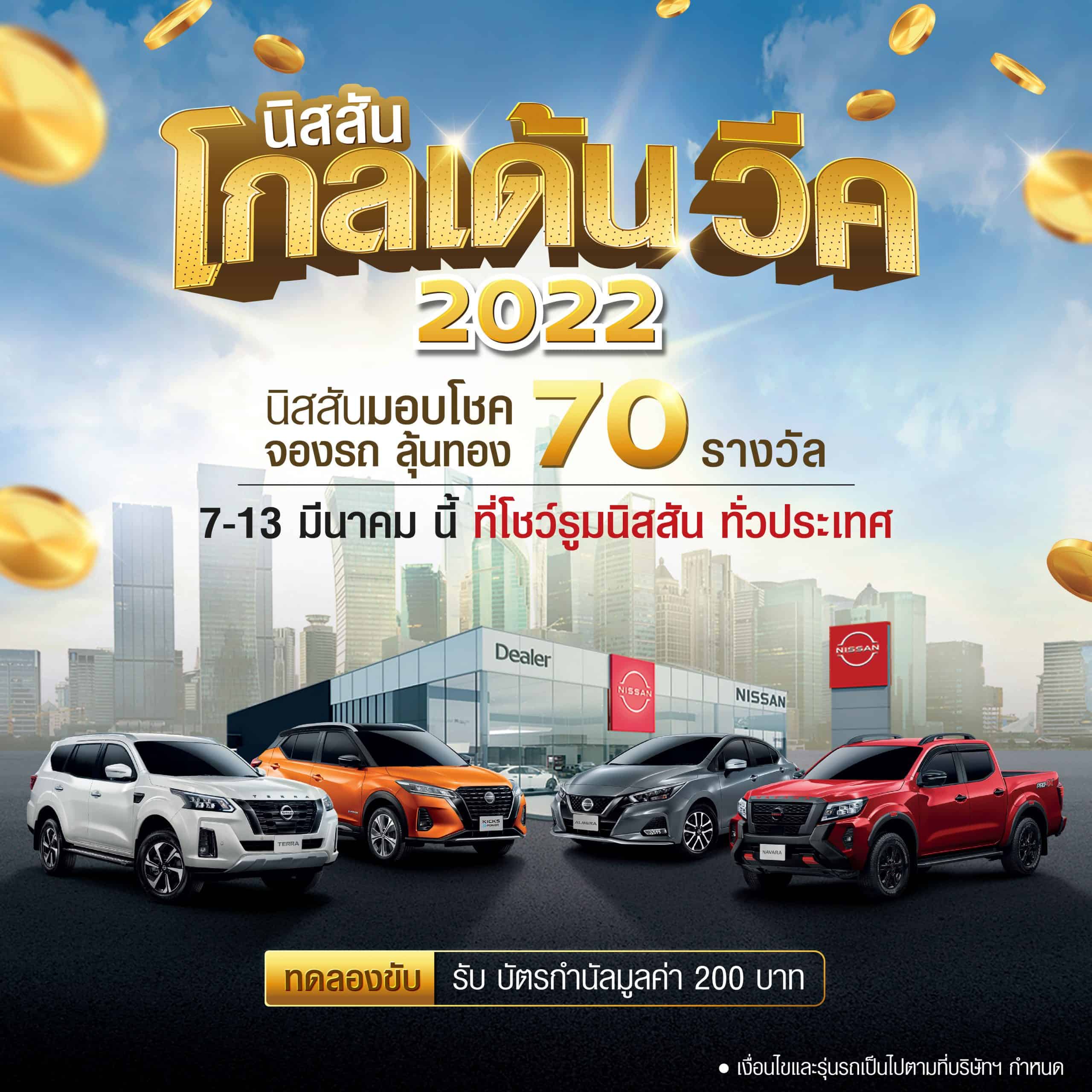 เมื่อจองรถนิสสันทุกรุ่น รับสิทธิลุ้นทองคำจำนวน 70 รางวัล รวมมูลค่ากว่า 2,700,000 บาท ตั้งแต่วันที่ 7 ถึง 13 มีนาคม นี้เท่านั้น นอกจากนี้ นิสสัน ขอเชิญชวนลูกค้าร่วมทดลองขับรถยนต์นิสสินทุกรุ่น ไม่ว่าจะเป็น อัลเมร่า รถยนต์ซีดานสำหรับคนเมืองยอดนิยม คิกส์ อี-พาวเวอร์ รถยนต์คอมแพ็คเอสยูวี โดนใจตั้งแต่ครั้งแรกที่ลองขับ เทอร์ร่า ใหม่ รถเอสยูวีสำหรับทุกคนในครอบครัว นาวารา รถกระบะที่กล้าเพื่อคนแกร่ง และรถนิสสันรุ่นยอดนิยมอื่น ๆ ที่โชว์รูมที่อยู่ใกล้บ้านและทั่วประเทศ รับบัตรกำนัลมูลค่า 200 บาท รวมมูลค่า 460,000 บาท ผู้ที่สนใจสามารถสอบถามรายละเอียดเพิ่มเติมได้ที่ Nissan Call Center โทร. 02-401-9600 หรือ นิสสัน ประเทศไทย เว็บไซต์