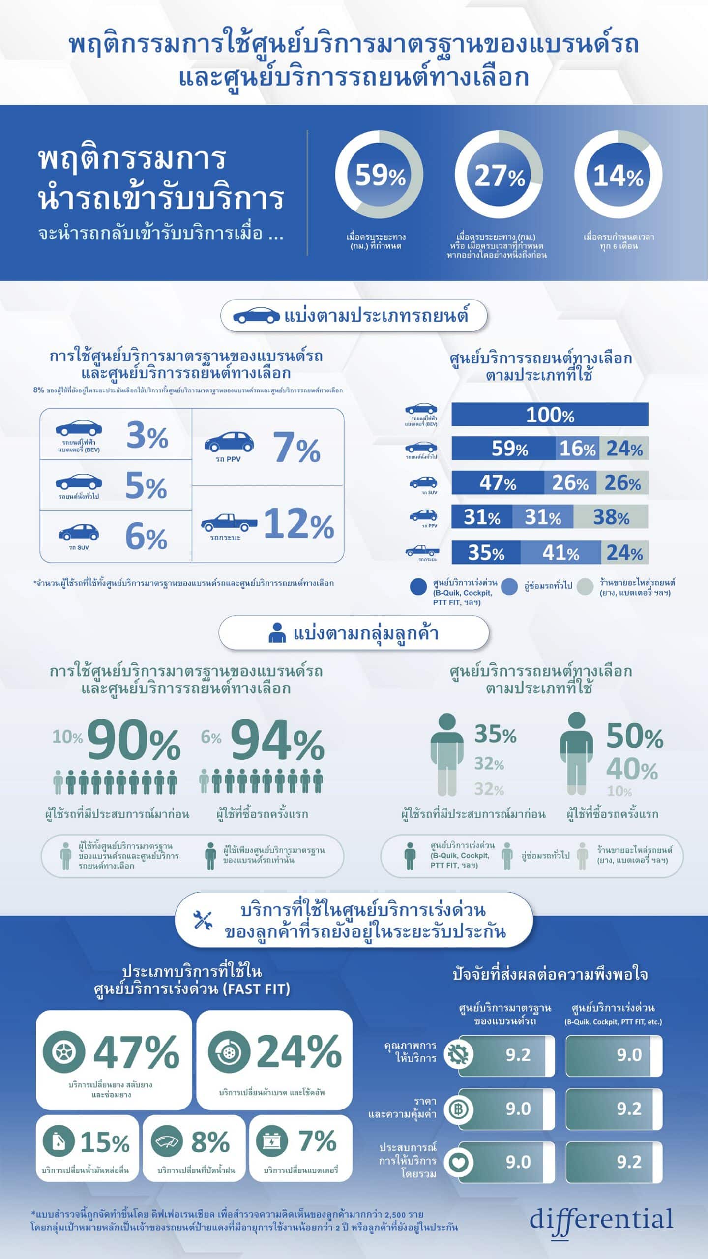 บริษัท ดิฟเฟอเรนเชียล (ประเทศไทย) จำกัด บริษัทที่ปรึกษาและวิจัยการตลาดชั้นนำ เผยผลสำรวจพฤติกรรมและประสบการณ์การใช้บริการศูนย์บริการรถยนต์ทั่วประเทศไทย ปี 2567 ในกลุ่มเจ้าของรถยนต์ใหม่ที่มีอายุการใช้งานไม่เกิน 2 ปี และยังอยู่ในระยะเวลาการรับประกันจากบริษัทรถยนต์ จำนวนกว่า 2,500 คน โดยเปรียบเทียบพฤติกรรมการใช้บริการจาก “ศูนย์บริการมาตรฐานของแบรนด์รถ” กับ “ศูนย์บริการรถยนต์ทางเลือก” ซึ่งประกอบด้วย 1) ศูนย์บริการซ่อมเร่งด่วน (Fast Fit) อาทิ B-Quik, Cockpit ฯลฯ 2) อู่ซ่อมรถยนต์ทั่วไป และ 3) ร้านจำหน่ายอะไหล่รถยนต์