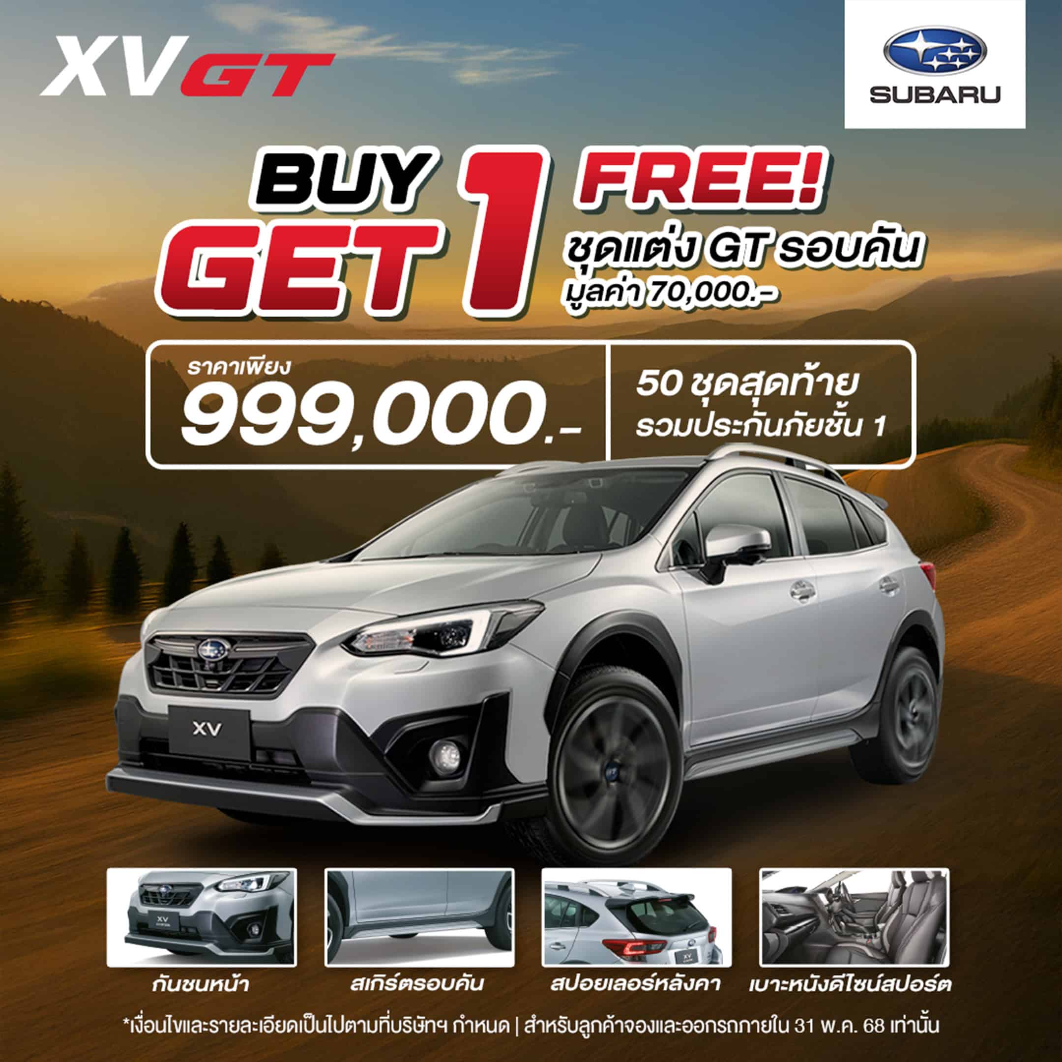 * ราคาพิเศษ จำนวนจำกัด ส่วนลด 390,000 บาท รุ่น XV 2.0 i-P + ชุดแต่ง GT Edition รอบคัน – เบาะหนังสีดำ ตกแต่งด้วยสีเทา จากราคา 1,389,000 เหลือ 999,000 บาท แคมเปญนี้ 50 คัน สุดท้าย ล็อตสุดท้าย CKD วันนี้ – 31 พฤษภาคม 2568 หรือ จนกว่าสินค้าจะหมด