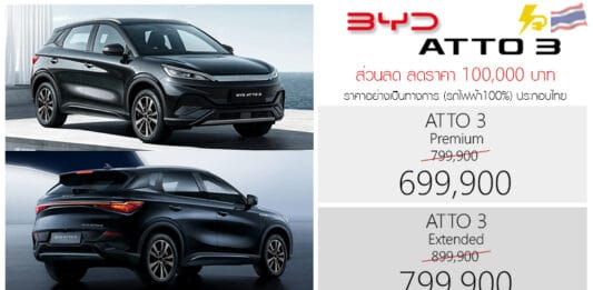 BYD Atto3 รถไฟฟ้า100% BYD Atto3 ราคาอย่างเป็นทางการ (ประกอบไทย) Atto3 Premium 799,900 699,900 บาท Atto3 Extended 899,900 799,900 บาท * ส่วนลด ลดราคา 100,000 บาท ในรุ่น Premium จาก 799,900 เหลือ 699,900 และ ส่วนลด ลดราคา 100,000 บาท ในรุ่น Extended จาก 899,900 เหลือ 799,900 บาท แคมเปญ Motor Show 2025 มาพร้อมการรับประกันคุณภาพตัวรถ Warranty โดย Rever Automotive ดังนี้ ประกันภัยชั้น 1 พร้อม พรบ. นานสูงสุด 1 … Continue reading ส่วนลด 100,000 บาท ! ราคาพิเศษ BYD Atto3 รถไฟฟ้า100% : 699,000 – 799,000 บาท (ประกอบไทย) | Extended Range