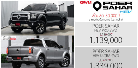 GWM POER SAHAR HEV ราคาอย่างเป็นทางการ (ประกอบไทย) POER SAHAR HEV PRO 2WD 1,189,000 1,139,000 บาท* POER SAHAR HEV ULTRA 4WD 1,389,000 1,339,000 บาท* * ส่วนลด ลดราคา 50,000 บาท ในรุ่น PRO 2WD จาก 1,189,000 เหลือ 1,139,000 บาท และ ส่วนลด ลดราคา 50,000 บาท ในรุ่น ULTRA 4WD จาก 1,389,000 เหลือ 1,339,000 บาท วันนี้ – 6 เมษายน 2568 มาพร้อมการรับประกันคุณภาพตัวรถ และ … Continue reading ส่วนลด ลดราคา 50,000 ! ราคาพิเศษ GWM POER SAHAR HEV : 1,139,000 – 1,339,000 บาท | กระบะ 4 ประตู Hybrid