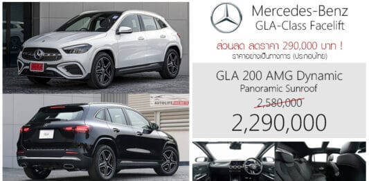 Mercedes-Benz GLA 200 Facelift (H247) ราคาอย่างเป็นทางการ (ประกอบไทย) GLA 200 AMG Dynamic Facelift 2,580,000 2,290,000 บาท * ส่วนลด 290,000 บาท สำหรับ GLA 200 AMG Dynamic จากราคา 2,580,000 บาท เหลือ 2,290,000 บาท ราคาเดียวทั่วประเทศ One Price ; Retail of the Future มาพร้อมการรับประกันคุณภาพ ดังนี้ รับประกันคุณภาพตัวรถ Warranty นาน 3 ปี ไม่จำกัดระยะทาง Mercedes-Benz GLA 200 AMG Dynamic Facelift (H247) แตกต่างจากรุ่นเดิม ดังนี้ ยกเลิก … Continue reading ส่วนลด 290,000 ! ราคาพิเศษ Mercedes-Benz GLA 200 Facelift : 2,290,000 บาท (ประกอบไทย) | หลังคากระจก Panoramic