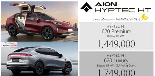 AION HYPTEC HT รถไฟฟ้า100% ราคาอย่างเป็นทางการ (นำเข้า CBU จีน) HYPTEC HT 620 Premium 1,449,000 บาท HYPTEC HT 620 Luxury Gull-Wing Doors 1,749,000 บาท มาพร้อมการรับประกันคุณภาพตัวรถ ดังนี้ รับประกันแบตเตอรี่ และ ชุดขับเคลื่อนไฟฟ้าแบบรวม ตลอดอายุการใช้งาน Lifetime Warranty (เฉพาะเจ้าของรถส่วนบุคคล ผู้ครอบครองรถลำดับที่ 1, และไม่ใช้งานรถในลักษณะเชิงพาณิชย์) *กรณีไม่เข้าตามเงื่อนไขด้านบน ระยะการรับประกันสำหรับชิ้นส่วนแบตเตอรี่ และระบบขับเคลื่อนไฟฟ้าแบบรวม จะถูกปรับเปลี่ยนเงื่อนไขการรับประกันเป็น 8 ปี หรือ 240,000 กิโลเมตร รับประกันคุณภาพรถยนต์ 8 ปี หรือ 160,000 กิโลเมตร รับประกันชิ้นส่วนประตูปีกนก 8 ปี หรือ 240,000 กิโลเมตร … Continue reading ราคาอย่างเป็นทางการ AION HYPTEC HT รถไฟฟ้า100% : 1,449,000 – 1,749,000 บาท | ประตูปีกนก Gull-Wing