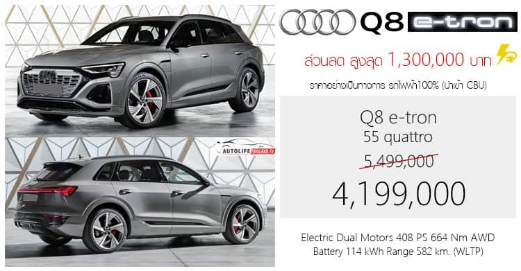 * ส่วนลด ลดราคา 1,300,000 บาท ในรุ่น Q8 e-tron 55 quattro จาก 5,499,000 เหลือ 4,199,000 บาท วันนี้ – 31 สิงหาคม 2025