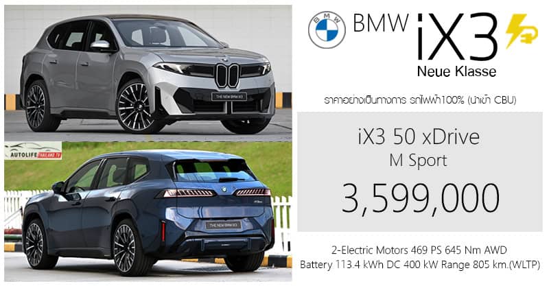 BMW iX3 Neue Klasse (NA5) รถไฟฟ้า100% ราคาอย่างเป็นทางการ : 3,599,000 บาท (นำเข้า CBU ยุโรป) วิ่งระยะ 805 km. (WLTP)