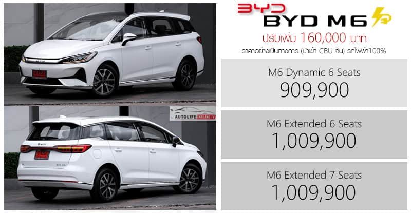 * M6 Dynamic ราคาหลังหักส่วนลด ปี 2025 จาก 749,900 ปรับเพิ่ม 160,000 บาท เป็น 909,900 บาท ในปี 2026 และ M6 Extended ราคาหลังหักส่วนลด ปี 2025 จาก 849,900 ปรับเพิ่ม 160,000 บาท เป็น 1,009,900 บาท ในปี 2026 มีผล 7 – 31 มกราคม 2026