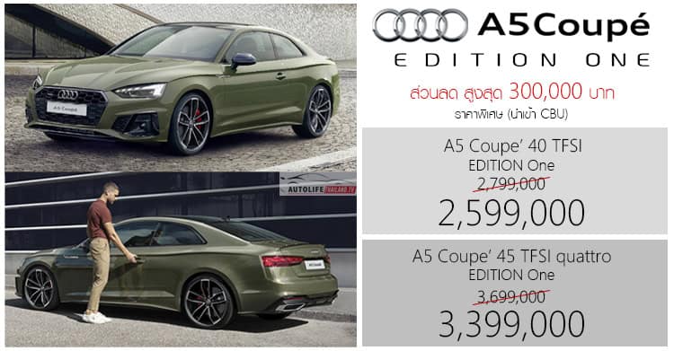 * ส่วนลด 200,000 บาท ในรุ่น A5 Coupe’ 40 TFSI EDITION One จาก 2,799,000 เหลือ 2,599,000 บาท และ ส่วนลด 300,000 บาท ในรุ่น A5 Coupe’ 45 TFSI EDITION One จาก 3,699,000 เหลือ 3,399,000 บาท ลดล้างสต๊อก วันนี้ – 31 ตุลาคม 2025
