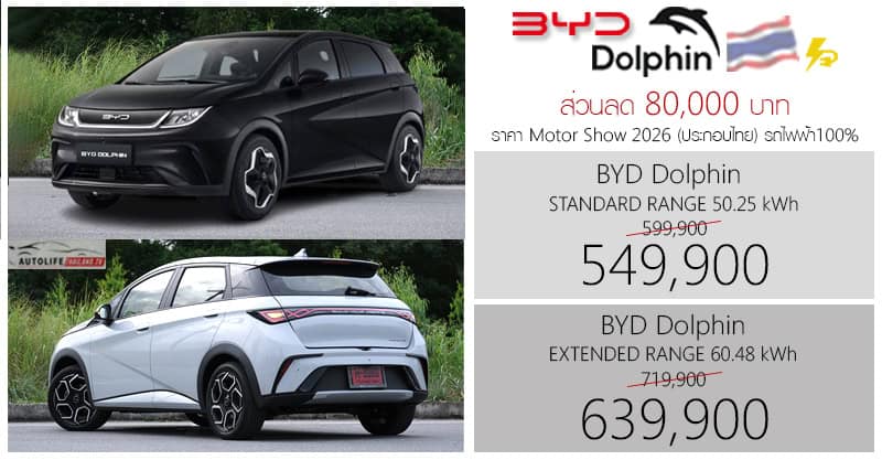 * ส่วนลด 50,000 บาท รุ่น Dolphin Standard จาก 599,900 เหลือ 549,900 บาท และ ส่วนลด 80,000 บาท รุ่น Dolphin Extended จาก 719,900 เหลือ 639,900 บาท แคมเปญ Motor Show 2026 มีผล 1 มีนาคม – 5 เมษายน 2569
