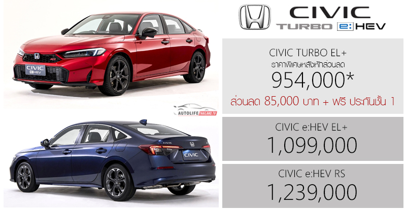 * ส่วนลด 85,000 บาท ราคาพิเศษหลังหักส่วนลด รุ่น Civic TURBO EL+ จาก 1,039,000 เหลือ 954,000 บาท พร้อม Honda Ultimate Care ขยายการรับประกันคุณภาพตัวรถเป็น 5 ปี หรือ 140,000 km. เริ่ม 1 ตุลาคม – 11 ธันวาคม 2025 และ รับรถภายใน 31 ธันวาคม 2025