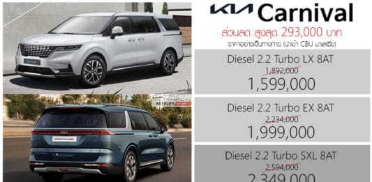 KIA Carnival LX / EX ราคาอย่างเป็นทางการ (นำเข้า CBU จากมาเลเซีย) 2.2 Diesel Turbo LX 1,892,000 1,599,000 บาท* 2.2 Diesel Turbo EX 2,234,000 1,999,000 บาท* 2.2 Diesel Turbo SXL 2,594,000 2,349,000 บาท* * ส่วนลด ลดราคา 293,000 บาท ในรุ่น LX จาก 1,892,000 เหลือ 1,599,000 บาท | ส่วนลด ลดราคา รุ่น EX จาก 2,234,000 เหลือ 1,999,000 บาท | ส่วนลด ลดราคา … Continue reading ส่วนลด ลดราคาสูงสุด 293,000 ! ราคาพิเศษ KIA Carnival 2.2 DIESEL TURBO : 1,599,000 – 2,349,000 บาท | เบาะ 11 ที่นั่ง