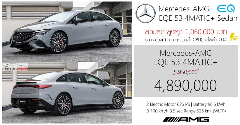 * ส่วนลด ลดราคา 1,060,000 บาท ในรุ่น Mercedes-AMG EQE 53 4MATIC+ Sedan จาก 5,950,000 เหลือ 4,890,000 บาท ราคาเดียวทั่วประเทศ One Price ; Retail of the Future มีผล 1 สิงหาคม 2025 เป็นต้นไป