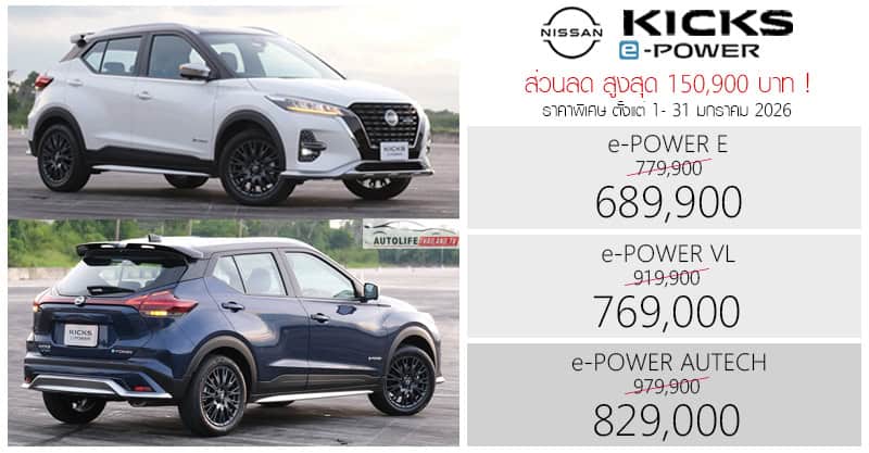 * ส่วนลด 90,000 บาท ในรุ่น e-POWER E จาก 779,900 เหลือ 689,900 บาท และ ส่วนลด 150,900 บาท ในรุ่น e-POWER VL จาก 919,900 เหลือ 749,000 บาท และ ส่วนลด 150,900 บาท ในรุ่น e-POWER AUTECH จาก 979,900 เหลือ 829,000 บาท มีผลตั้งแต่ 1 – 31 มกราคม 2026