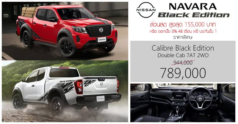 * ส่วนลด 155,000 บาท ในรุ่น NAVARA Double Cab Calibre Black Edition จาก 944,000 เหลือ 789,000 บาท หรือ เลือกรับ ดอกเบี้ย 0% 48 เดือน พร้อมส่วนลด 34,000 บาท และ ฟรี ประกันภัยชั้น 1 วันนี้ – 31 ตุลาคม 2025