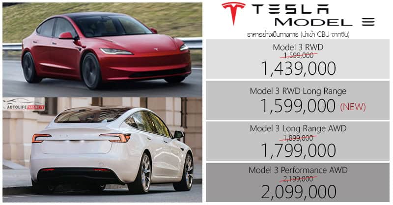 TESLA Model 3 ราคาอย่างเป็นทางการ (นำเข้า CBU จากประเทศจีน) โดยบริษัทแม่ Tesla Official (Thailand)