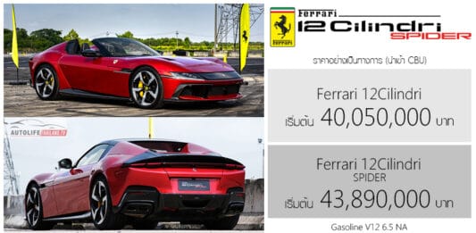 Ferrari 12Cilindri / 12 Cilindri Spider ราคาอย่างเป็นทางการ เริ่มต้น 40,050,000 – 43,890,000 บาท | V12 NA 6.5L 830 แรงม้า ราคาอย่างเป็นทางการ (นำเข้า CBU) 12 Cilindri เริ่มต้น 40,050,000 บาท 12 Cilindri Spider เริ่มต้น 43,890,000 บาท โดย Cavallino Motors (คาวาลลิโน มอเตอร์) ผู้จำหน่าย และ บริการหลังการขาย Ferrari อย่างเป็นทางการในประเทศไทย Ferrari 12Cilindri (อ่านว่า โดดิชี่ ชิลินดรี่) และ Ferrari 12Cilindri Spider (อ่านว่าโดดิชี่ ชิลินดรี่ สไปเดอร์) เป็นภาษาอิตาเลียน … Continue reading Ferrari 12Cilindri / Spider ราคาอย่างเป็นทางการ เริ่มต้น 40,050,000 – 43,890,000 บาท | V12 NA 6.5
