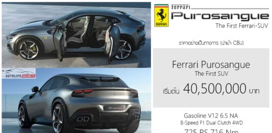 Ferrari Purosangue : The First-SUV ราคาอย่างเป็นทางการ (นำเข้า CBU) โดย คาวาลลิโน มอเตอร์ Cavallino Motors ผู้จำหน่าย และ บริการหลังการขาย Ferrari อย่างเป็นทางการในประเทศไทย https://www.facebook.com/cavallinoferrarithailand/ Ferrari Purosangue เริ่มต้น 40,500,000 บาท Engine เครื่องยนต์ เครื่องยนต์เบนซิน V12 ทำมุม 65 องศา ขนาด 6.5 ลิตร NA (Natural Aspirated) ไม่มีระบบอัดอากาศ กระบอกสูบ x ระยะช่วงชัก : 94.0 x 78.0 มิลลิเมตร อัตราส่วนกำลังอัด 13.6 : 1 พละกำลังสูงสุด 725 แรงม้า ที่ 7,750 … Continue reading ราคาอย่างเป็นทางการ Ferrari Purosangue เริ่มต้น 40,500,000 บาท | V12 6.5 NA 725 แรงม้า The First-SUV