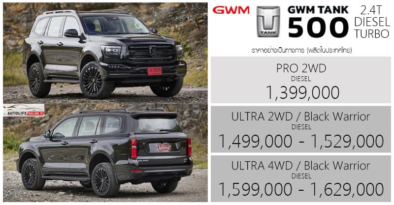 GWM TANK 500 DIESEL ราคาอย่างเป็นทางการ : 1,399,000 – 1,629,000 บาท ดีเซล 2.4 เทอร์โบ 2WD / 4WD