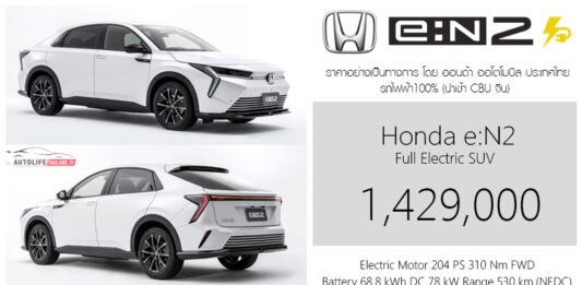 Honda e:N2 รถไฟฟ้า100% Honda e:N2 ราคาอย่างเป็นทางการ (นำเข้า CBU จีน) โดย ฮอนด้า ออโตโมบิล ประเทศไทย e:N2 1,429,000 บาท มาพร้อมการรับประกันคุณภาพ ดังนี้ รับประกันคุณภาพตัวรถ Warranty 3 ปี หรือ 100,000 กิโลเมตร พร้อม Ultimate Care เพิ่มอีก 2 ปี 40,000 กิโลเมตร (รวมเป็น 5 ปี 140,000 กิโลเมตร) รับประกันมอเตอร์ และ ระบบขับเคลื่อน นาน 5 ปี ไม่จำกัดระยะทาง รับประกันแบตเตอรี่ นาน 8 ปี หรือ 160,000 km. ฟรี Home Charger … Continue reading Honda e:N2 รถไฟฟ้า100% ราคาอย่างเป็นทางการ : 1,429,000 บาท (นำเข้า CBU จีน) แบต 68.8 kWh DC 78 kW วิ่งระยะ 530 km.