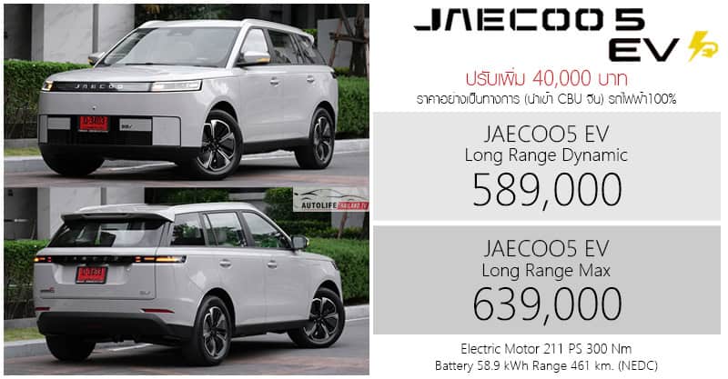 JAECOO 5 EV รถไฟฟ้า100% ราคาอย่างเป็นทางการ : 589,000 – 639,000 บาท | ปรับเพิ่ม 40,000 มีผล 11 ธันวาคม 2025